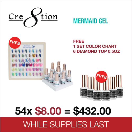 Cre8tion Mermaid Soak Off Gel - Full Set 54 Colors - FREE 1 Set Color Chart - 6 Diamond Top 0.5oz