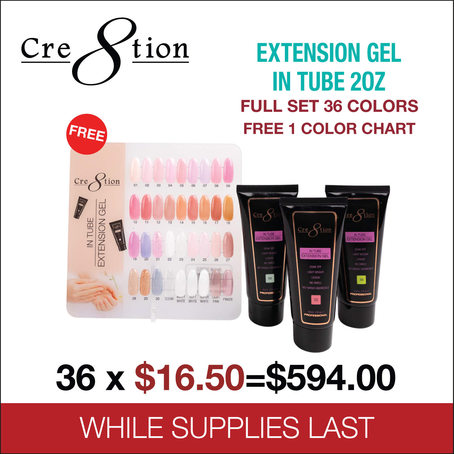 Cre8tion Poly Gel-Extension Gel In Tube 2oz - Full Set 36 colors w/ 1 Set Color Chart