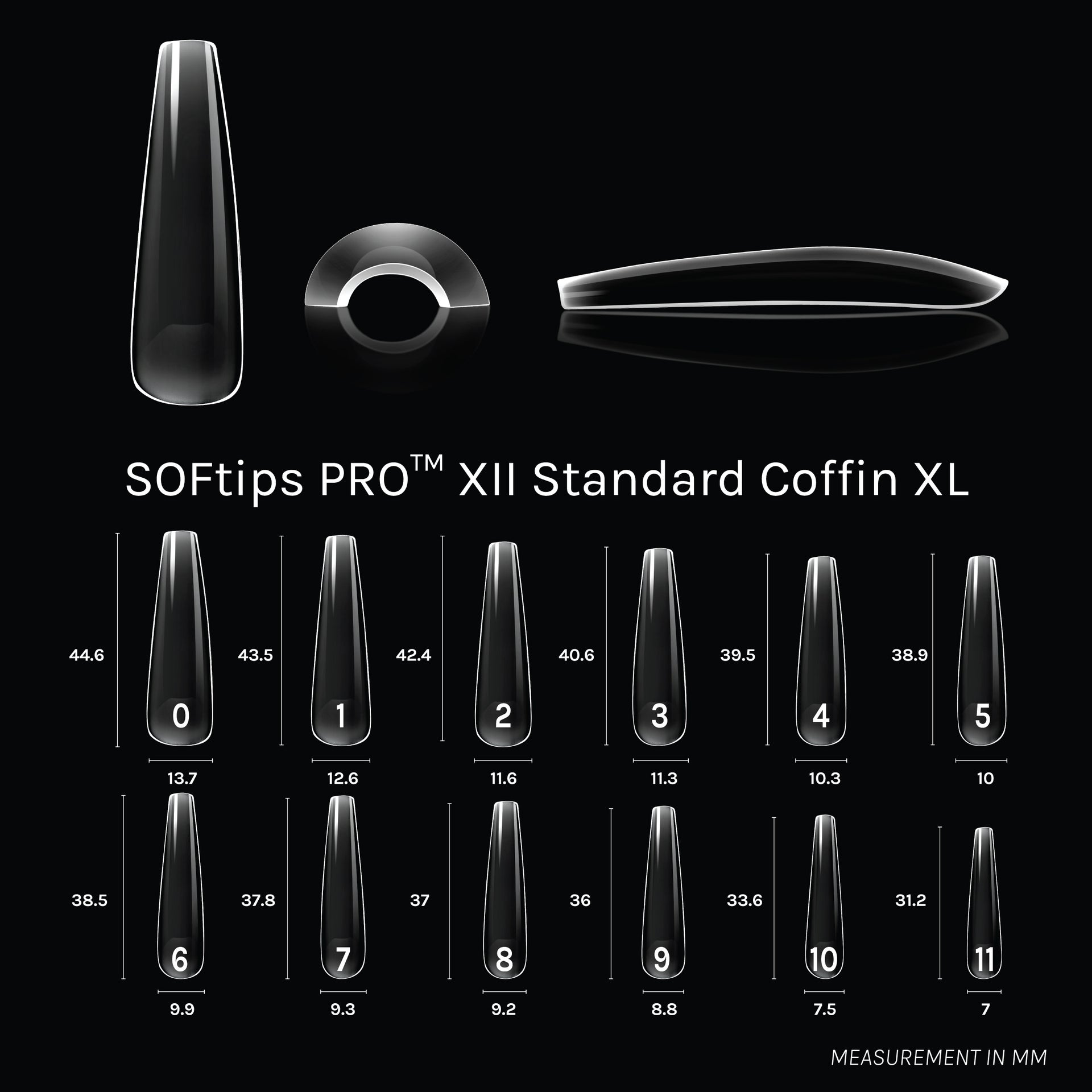 Premium quality, full coverage soft gel tips for natural & lightweight nail extensions. Explore the SOFTIPS PRO XII™ collection of Standard Style tips- pre-shaped tips featuring a thin, flexible base that can be molded to fit the unique contours of your natural nails- flat or rounded. XII tip shapes are 'natural-style' in shape- lower apex, less of a c-curve. Comes in a 12-size spread.