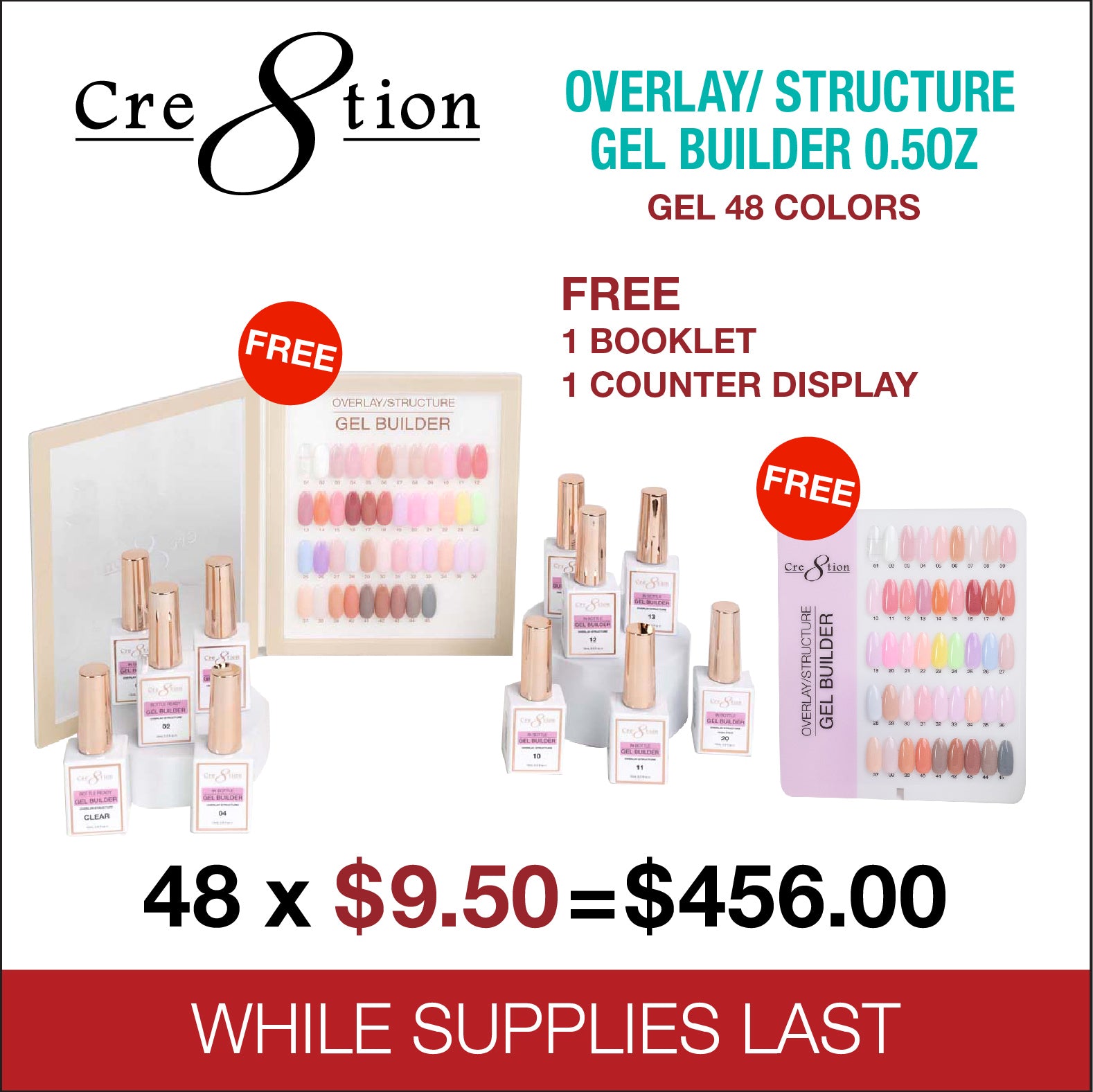 Cre8tion Gel Collection - Overlay/ Brush on Builder 0.5oz - Full Set 48 Colors w/ 1 Acrylic Booklet & 1 Counter Display
